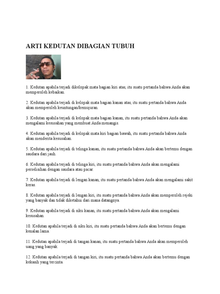 Pertanda baik yang dimaksut ini bisa dalam berbagai bentuk. Kedutan tekukan lutut kanan isyarat baik, karena diramalkan oleh primbon. Adapun kedutan betis kiri merupakan suatu pertanda baik, dijelaskan bahwa kedutan ini merupakan pertanda bahwa anda akan bersuka hati dalam waktu dekat. Kedutan mata kiri bawah bisa diartikan menurut kepercayaan tentang primbon, yang bisa mendatangkan pertanda baik atau buruk bagi orang yang mengalami kedutan. Kedutan betis kanan, akan bepergian jauh.